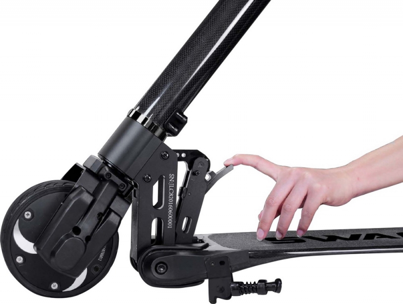 車架─電動滑板車的車架結構常見以碳纖維或鋁合金兩種材質,重型大車款多採用鋁合金,相對硬朗且幾乎不形變特性,耐重和承載力較高,騎乘較不易飄移;而定位在輕量型車款則以碳纖維為主,除了重量輕、便攜外,也具有震動衰減優點。