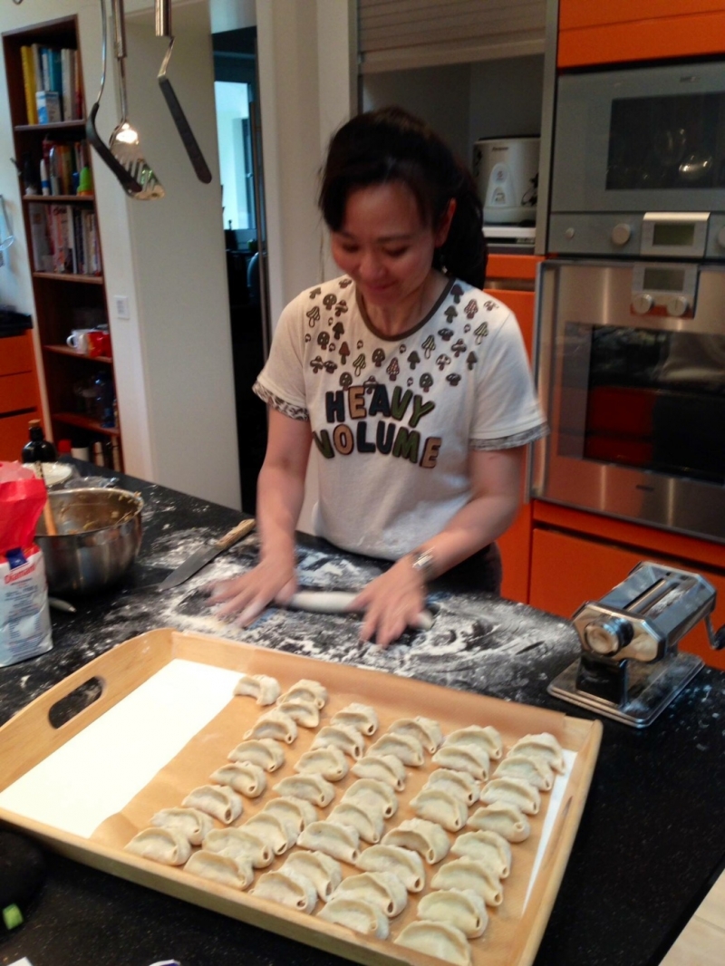 在我家吃多了餃子,後來德國人就自然而然地為餃子取了個德文名字:die chinesische Teigtasche, 直譯就是「中國麵皮口袋」的意思。因為不是只有華人包餃子、鍋貼、包子、餛飩……,德國菜裡面也有Maultasche,意大利菜裡面也有Ravioli,Tortellini,都是麵皮包肉、或素、或乳酪的食品。說真的,即使調味料東西南北各異,各國的麵皮口袋還都特好吃。