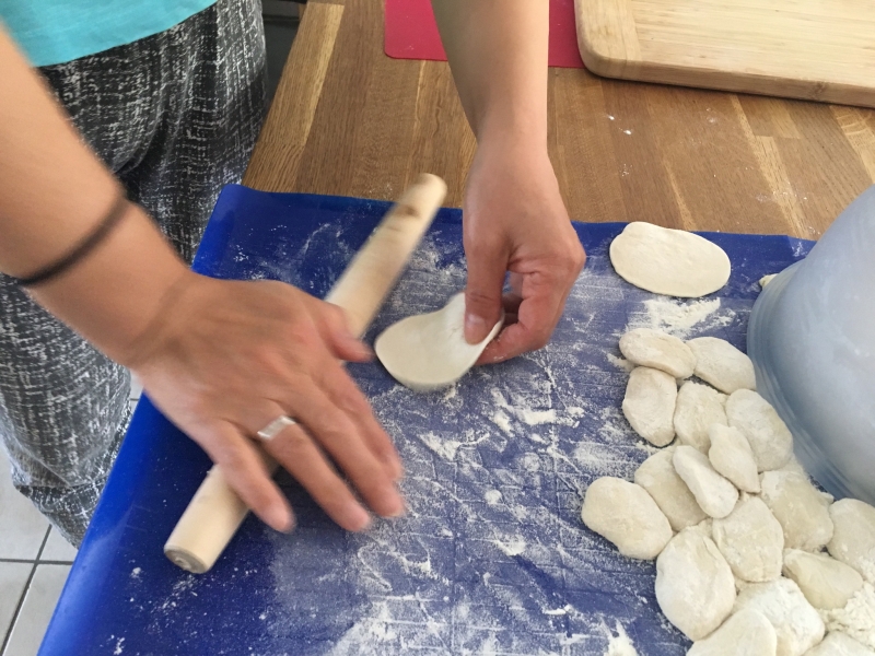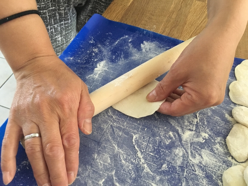 我們華人包的餃子跟人家歐洲的麵皮口袋最不一樣的地方,就是咱們的餃子、包子、盒子……皮子都是一個一個拿擀麵棍擀出來的,包一百個就得各別擀一百個麵皮,偷不得懶。而且理想的皮子,是外緣薄,圓心厚。蒸餃、水餃用的是冷水麵糰,鍋貼、生煎包、韭菜盒子用的則是燙水麵糰。一個一個,同時一邊用左手拇指、食指及中指捏麵,並快速轉動小麵糰,一邊用右手操使擀麵棍,擀圓棍下打轉的麵皮,最後再依形狀,各別捏出邊花。西方的麵皮口袋則不然,幾乎都是把麵糰用大棍子擀開,成為一個跟媲美桌布的等厚大麵皮,再用刀子切割出所需的形狀,或用杯子口扣出圓形,他們的麵皮口袋幾乎都是躺著的,站不起來,包法一律是盛一小勺餡料置於分割好的麵皮中心上,再用另一張麵皮往上蓋住,周邊捏緊。所以,計算好長寬,切割整齊,不論是誰包出來的麵皮口袋都長得一致,不似中式餃子,十個人包,就有十個或挺、或歪、或躺、或站的奇形怪狀。