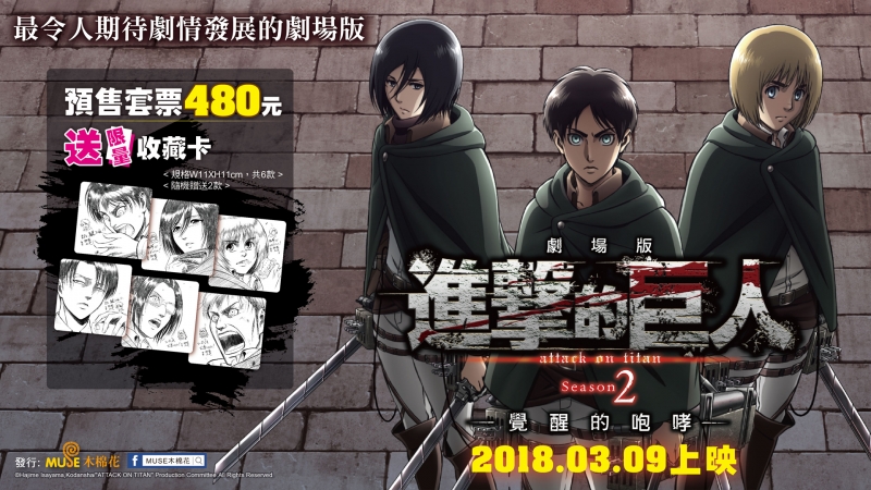 1月26日起記得到『木棉花購物網』、『博客來售票網』、『買動漫平台』、『金石堂網路書店』、『安利美特』、台中『捷比漫畫便利屋』、高雄『GAMEMAX遊戲巨蛋』與『台北動漫節』展場,搶購預售套票(售價480元),就能擁有精美「手繪調查兵團角色珍藏卡」,款式有神秘力量的「艾連」、帥氣王樣兵長「里維」、最強的腹肌女神「米卡莎」、兼具智慧與勇氣的「阿爾敏」、對巨人有莫名喜好與堅持的「漢吉」、與犧牲小我的團長「艾爾文」六款,款款限量,想要整套收藏,趕快記好搶購的時間啊!