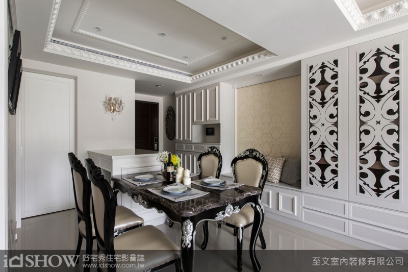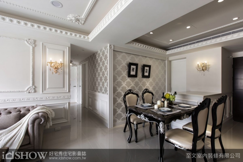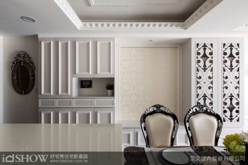 餐廳天花四周滾上美式線板,細膩的紋路表現為視覺印象加分。