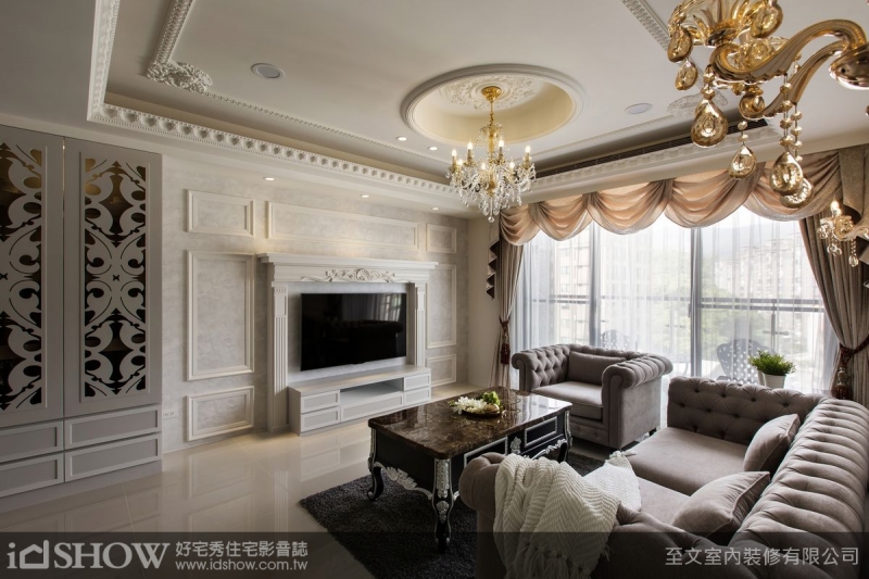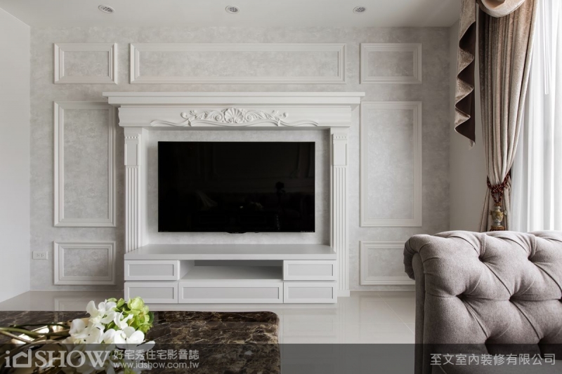 客廳壁爐造型的電視牆面淋漓盡致的展現新古典風的華美壯麗氣勢,讓人彷彿在一瞬間感受到法國凡爾賽宮的奢華震撼。