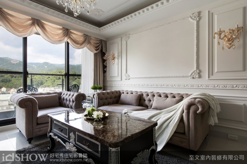 並且客廳的底層天花採圓頂上凹設計,於是水晶燈的精美通透特色被加倍突顯,而家具也選用低背壓扣設計,於是沙發背牆成為端景,在兩側壁燈襯托下,更顯尊貴不凡。而窗外可遠眺山景,令屋主時時刻刻都能保有悠閒愜意的好心情。至於主臥室的四腳華麗大床,則與整體新古典風相呼應,在窗外明亮陽光烘托下,散發彷彿人在歐洲的亮麗光芒。