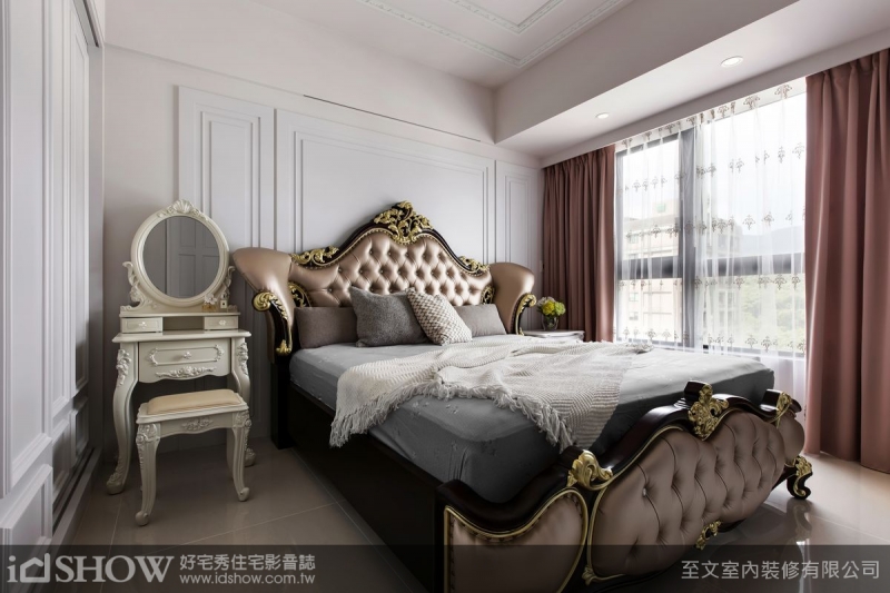 主臥室的四腳華麗大床,則與整體新古典風相呼應,在窗外明亮陽光烘托下,散發彷彿人在歐洲的亮麗光芒。