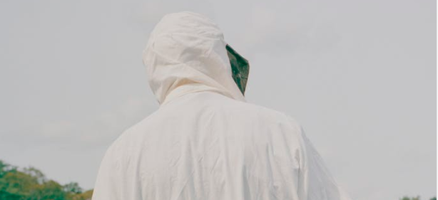 他們腳蹬黑色的膠鞋,身穿又肥又白的罩子,臉也都得遮蓋住……