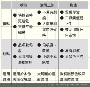 進行DIY 粉刷的工作重點: 自行粉刷油漆其實很適合用滾筒塗刷,一次就可以蓋過下方的漆面,且不易產生刷痕適合大面積塗刷,缺點是漆料容易噴濺,得由下往上推並做好防護。只是較小的面積還是要用刷子上漆。通常要將一份水加上四份漆料(乳膠漆)稀釋,以一次橫刷一次直刷的方式上漆,次刷完就著室內光線觀察哪個方向刷痕較不明顯,用該方向再刷一次。不論用滾輪或是刷子,都要用M字型或W字型進行;進行同一層粉刷時,刷面盡量不要重疊或重複塗刷某處,避免漆膜不均勻。
