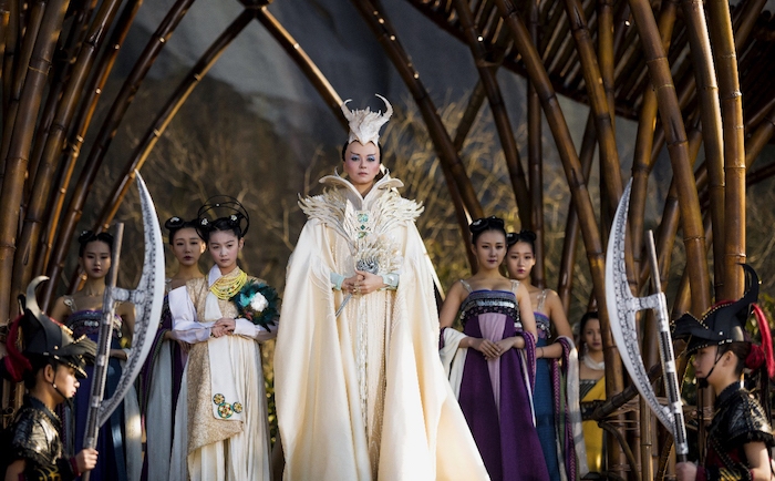 在如此特別的女兒國度當中,女生無疑擁有著至高無上的權力。海報索性將女兒國的佳麗三千展現在世人面前,這也是部全球女演員最多的電影,堪稱影史之最。而女王-趙麗穎作為一國之首,傾城傾國的外表下流露出觸不可及的威嚴;國師-梁詠琪剛硬的造型充滿著神秘氣息。不禁讓唐僧發問:徒弟們,是不是想留在這不走了?