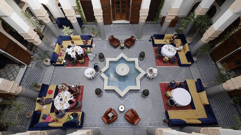 Riad源自阿拉伯語,是「庭院」的意思,也是摩洛哥古老房屋建築形式的一種。這幾年全球吹起老屋改建的風潮,老屋改建的時尚設計旅宿也在摩洛哥大放異彩。當地人將破舊不堪的Riad或Dar古宅整修,改建成餐廳、民宿,用來招待觀光客,也因此Riad這個名詞便廣泛運用在住宿旅店中,向世界的旅客宣告:我們是深具摩洛哥風情的老屋旅宿。 傳統摩洛哥房子是圍繞最底樓的庭院而建,要尋找美麗的Riad旅店就要在摩洛哥麥地納(註:麥地納Medina阿拉伯人的老城區之意)巷弄中探尋,Riad或Dar,全都隱藏在彎彎曲曲的巷弄中,從門外看起來都不怎麼起眼,推開門入內才豁然大開眼界,美麗的中庭景致、漂亮精緻的馬賽克拼磚,讓人目不轉睛,驚嘆連連。