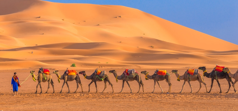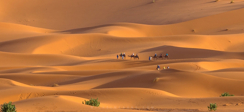 傍晚,沙漠入口一隊隊的駱駝拉著長長的影子朝沙漠深處前進,騎駱駝進入沙漠,才算真正的踩上了撒哈拉沙漠。每一隊駱駝各有不同的目的地營區,但相同的是會在沙漠當中停下來,讓旅人享受沙漠夕陽餘輝灑落身上的療癒時刻。在放眼四周一望無際的沙堆中,牽駱駝的小伙子很神奇的總能找到營區的正確方位。