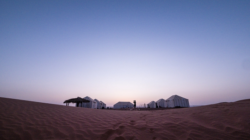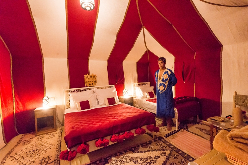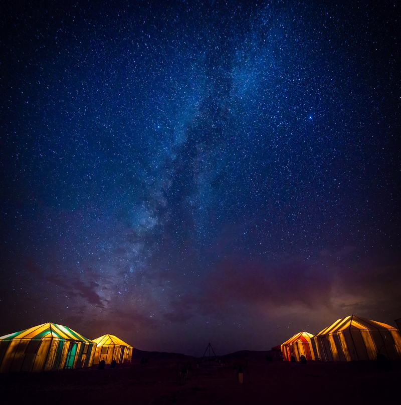 摩洛哥著名的奢華帳蓬營區,讓旅客在沙漠中有超乎期待的奢華體驗,高級帳篷內有熱水淋浴及沖水馬桶,完全不似想像中的不方便。營區餐廳提供的晚餐竟還可以點紅酒,最感人的是沙漠中的營區竟有wifi。