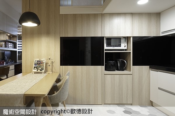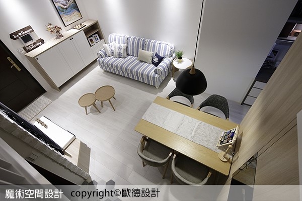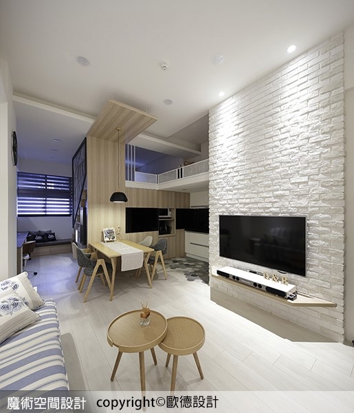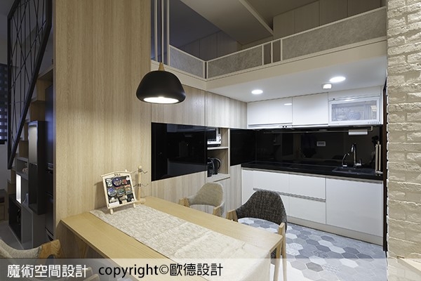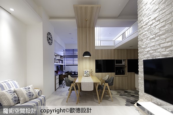 本案為挑高 3 米 6 的夾層屋,即使是小坪數但是各項功能齊備,Order 歐德傢俱連鎖事業的設計師呂冠忠及工程設計師黃正泓的精心規劃,保留原有夾層設計、運用木板延伸高度,並導入文化石、鐵件與六角花磚塑造北歐工業的居家風格,搭配使用無毒低甲醛的歐德系統傢俱來妥貼收納,賦予家中寬敞自在的乾淨樣貌,讓機能清楚劃分,空間完整延展。