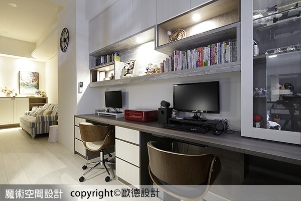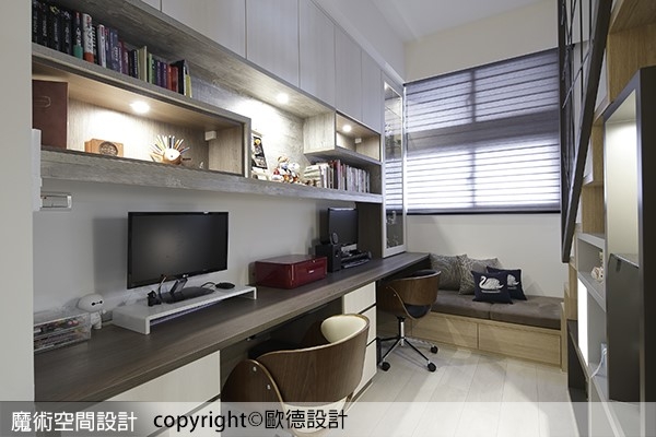 2.傳統書房使用循規蹈矩的方正格狀書架,容易使空間顯得呆板僵硬,如何找尋符合需求的現代書櫃?不妨參考醫生夫妻選擇的錯落式長型書櫃,以柔和線條 + 溫潤木作,結合高度統一的收納空間,能恰到好處的放置書本、相框與模型等物品,同時連結備有插座的長形雙桌面,滿足兩人一同休憩、工作的時候。此外,書櫃造型也呼應一旁樓梯的幾何欄杆,傳遞動感流暢的居家動力。