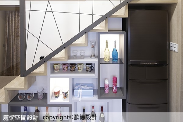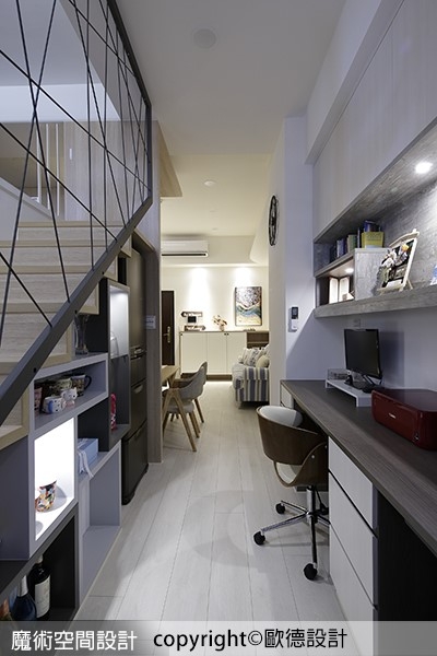 針對小坪數空間,使用面積更得精打細算,針對家中任何一個角落,特別是樓梯下方的畸零空間,採用依高度漸進的收納櫃體,展現與臥室共通的高功能,可置入大體積的冰箱、與不同灰階色彩櫃子,搭配燈光調節氛圍,表現系統櫃的趣味性格。另外,除了樓梯下方的剩餘空間,樓梯層板也遵循「善用空間」之核心概念,結合休憩臥榻及收納功能,滿足屋主需求也增加小坪數的無限可能。