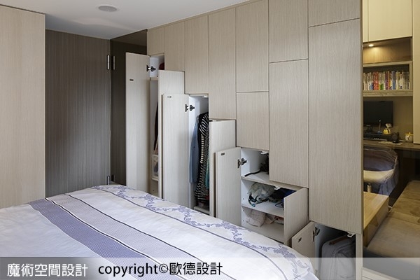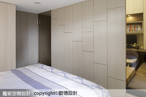 ▲設計師改變舊有格局,採用與廚房相連的系統牆板創造臥室暗門,營造不突兀的獨立空間