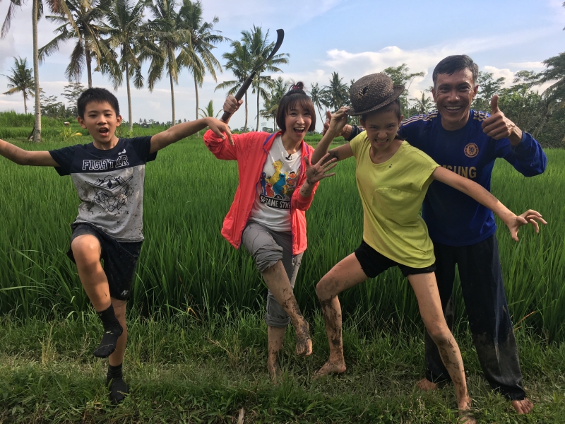 湘涵和2位小小背包客爬上印尼德哥拉朗梯田體驗下田工作。