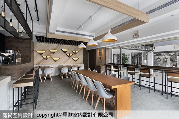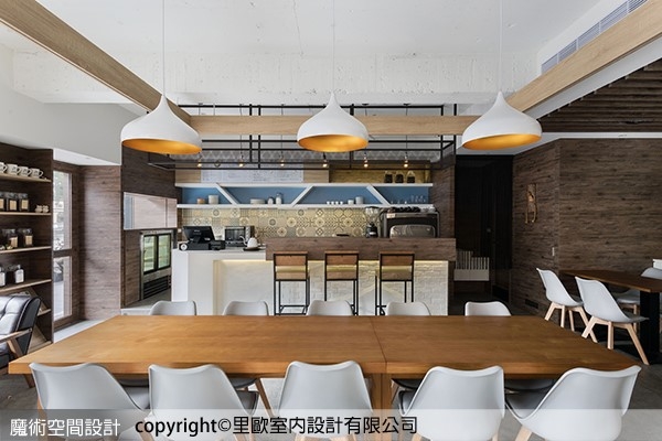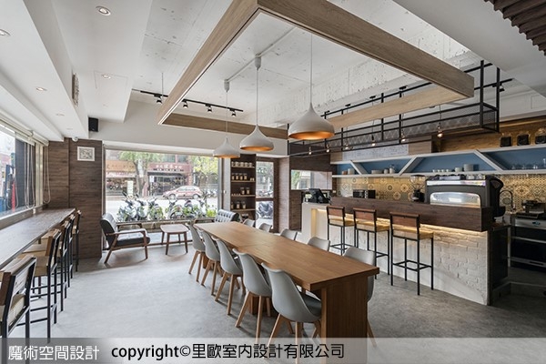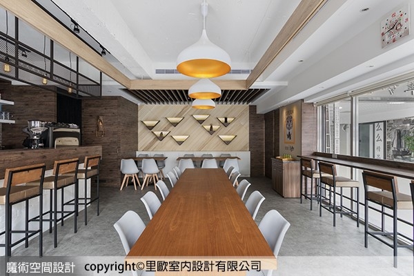 ▲里歐設計偕志宇設計總監以開放方式設計,降低空間的侷促性,圍塑出工作吧台兼具櫃台機能,沙發區、靠窗區、卡座以及團體區域,建立開放而各自機能獨立的區域關係。