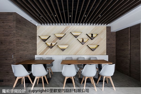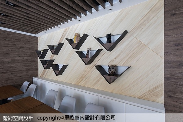 1.里歐設計偕志宇設計總監於空間底端主牆面,以鐵件做V形雷射切割,形塑出展示的主題意象,具畫龍點睛的焦點效果,帶著具主題性以及豐富的變化意趣。