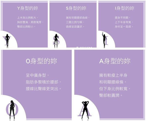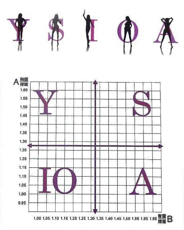 有Y倒三角形、S葫蘆形,I直筒腰形、O蘋果形、A西洋梨形,I型等5種不同的比例