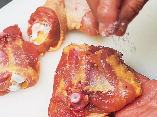 4.每支棒腿肉的切面(肉身)都各撒上0.5∼1g的鹽。手握住整塊肉順勢用力往外拉幾次來完成塑形。
