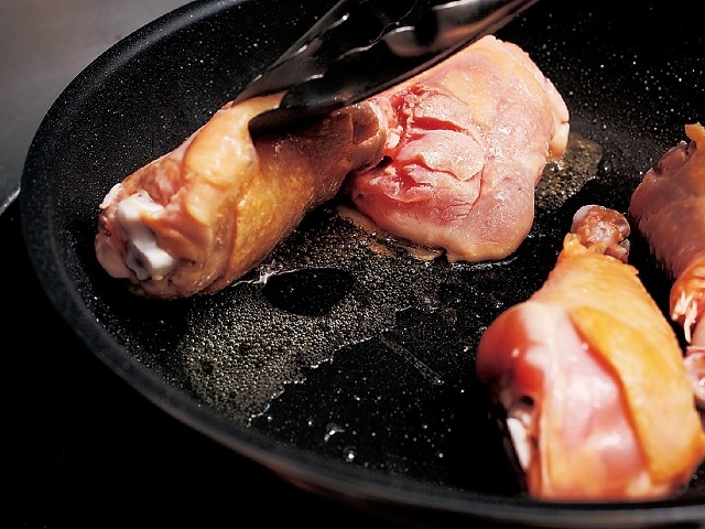 6.將5 翻面,讓皮朝下煎煮。棒腿肉也入鍋。(鐵氟龍平底鍋請勿事先預熱。此為煎煮帶皮雞肉時的鐵則。)