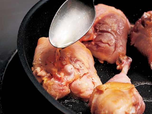 8.讓平底鍋傾斜,邊加熱邊用湯匙舀起熱油淋在雞肉上(此謂油淋法─請小心避免被熱油燙傷。選用稍大的長柄湯匙比較安全。)。