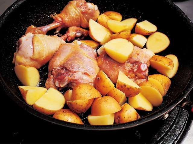 9.棒腿肉上色到一定程度後,將馬鈴薯倒入。搖動平底鍋,讓材料裹滿油來煎煮。(把雞肉的美味湯汁也分享給馬鈴薯。放入1整顆帶皮的大蒜會更好!)