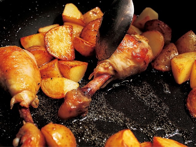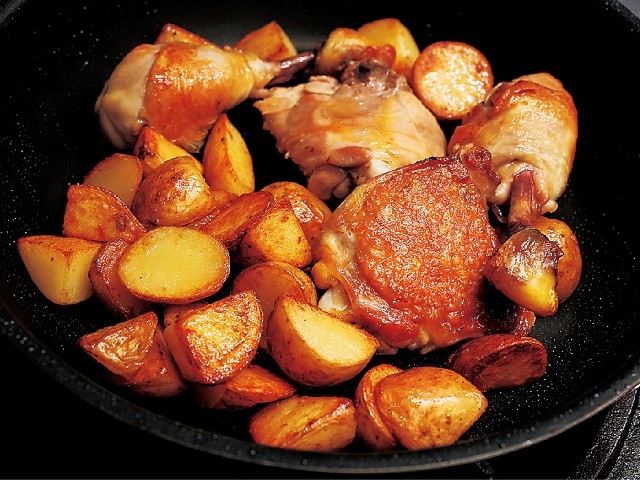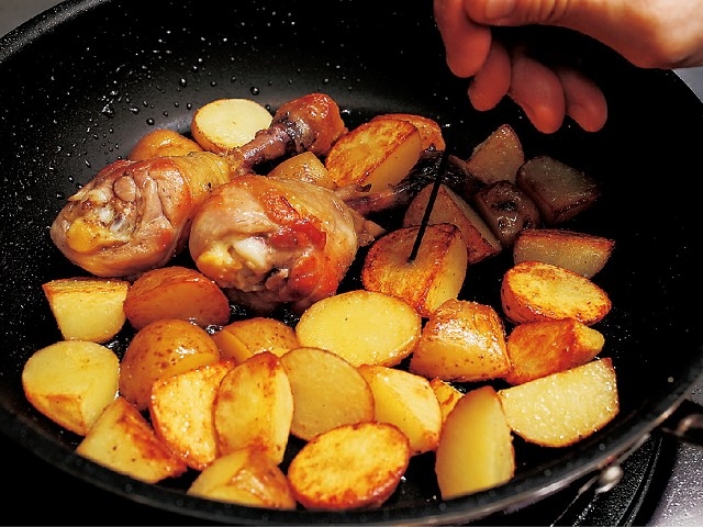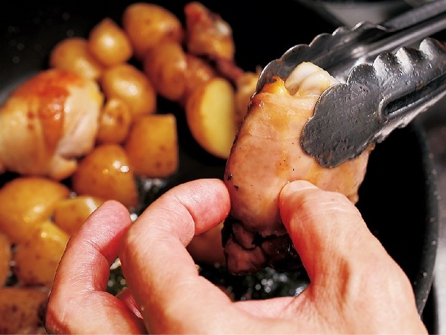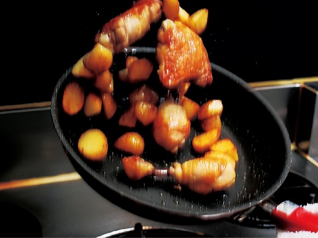 16.再多晃動幾次平底鍋,將馬鈴薯煎出令人食指大動的金黃色。(只觀察馬鈴薯的色澤。雞肉已經完全煎熟,所以無須在意。也要聆聽聲音,從14 開始會因為油減少而產生變化。)