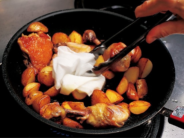15.用廚房紙巾將多餘的油擦拭乾淨。(鮮味已經完全遍及雞肉與馬鈴薯,所以多餘的油會干擾味道。請擦拭乾淨。)