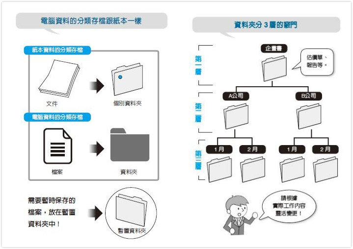 如果對電腦的管理太過輕忽,不但會遺失重要檔案,還會重複無謂的工作,不斷的加班。因此,請大家用心思考要用怎麼樣的方法,才能有效管理電腦的檔案。