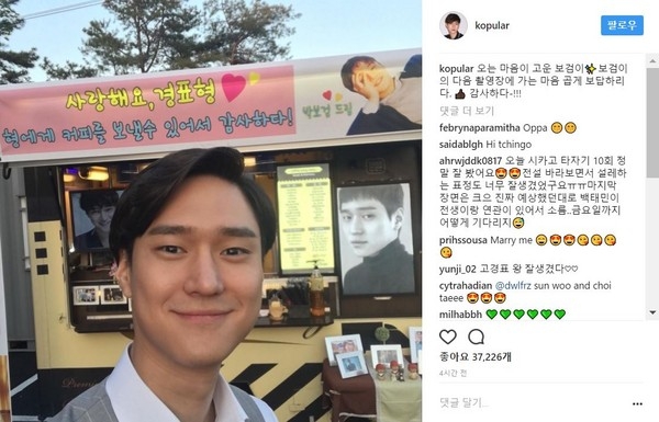 韓國不少明星展現好交情,都會互送餐車表示應援,像是少女時代的秀英,跟鄭敬淏戀愛長跑多年,前陣子男友拍攝《機智牢房生活》,就不避諱的送上應援車,讓人覺得閃暴眼~而去年高庚杓正在趕拍tvN電視劇《芝加哥打字機》時,就收到可愛弟弟朴寶劍的應援,上頭甚至還寫著「可以讓我幫哥送咖啡覺得很感激」,天啊,真心覺得這樣的兄弟情好像有點閃,而且也太謙虛了吧,當然高庚杓也回應之後也會這樣回報他!