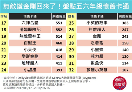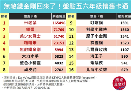 那些美好的童年時光,總少不了動畫的陪伴,否則,隔天上課怎麼參加同學的討論呢?這次DailyView網路溫度計透過《KEYPO大數據關鍵引擎》製造了一台時光機,就讓我們來懷舊一下,看看最受5、6年級歡迎的動畫吧!