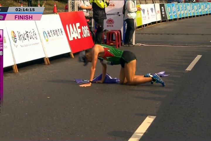 新北市萬金石馬拉松開跑,選手衝過終點線,但沒想到這位冠軍跑者,才剛過終點沒有幾公尺卻突然暈眩倒地。