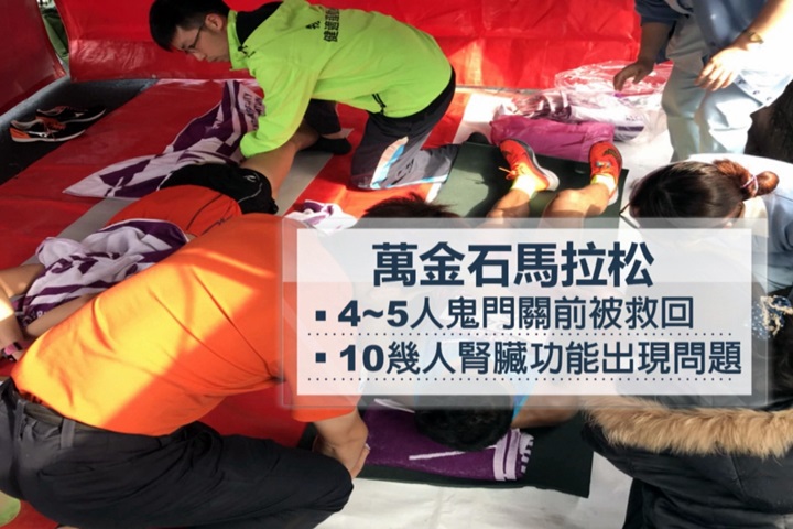 一張張從現場傳出的照片,都是參加比賽的跑者,昏厥在救護站休息的紀錄。比完賽後,沒想到附近醫院湧入大量傷患,有4~5名跑者鬼門關前走一遭被救回,還有10幾個人腎臟功能出現問題。有醫生提醒,主辦單位勿沾沾自喜,跑者要量力而為。