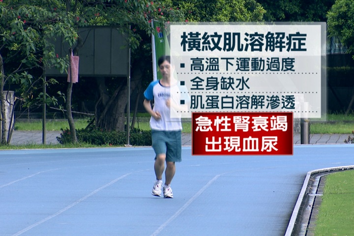 所謂橫紋肌溶解症,常發生在高溫下運動過度的患者上,由於全身缺水沒有適時補充,導致肌肉蛋白溶解滲透,造成急性腎衰竭,甚至出現血尿,嚴重有可能致命。