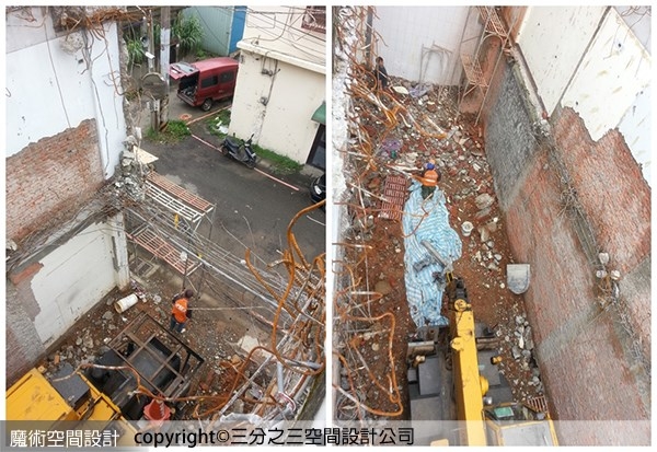 ▲三分之三空間設計黃郁隆總監建議連棟舊透天厝重建時,拆除工程以精密夾取式咬合機和人力手工拆除,保留與鄰屋相連鋼筋的完整性,可確保結構安全。