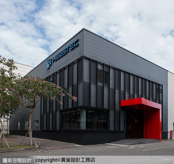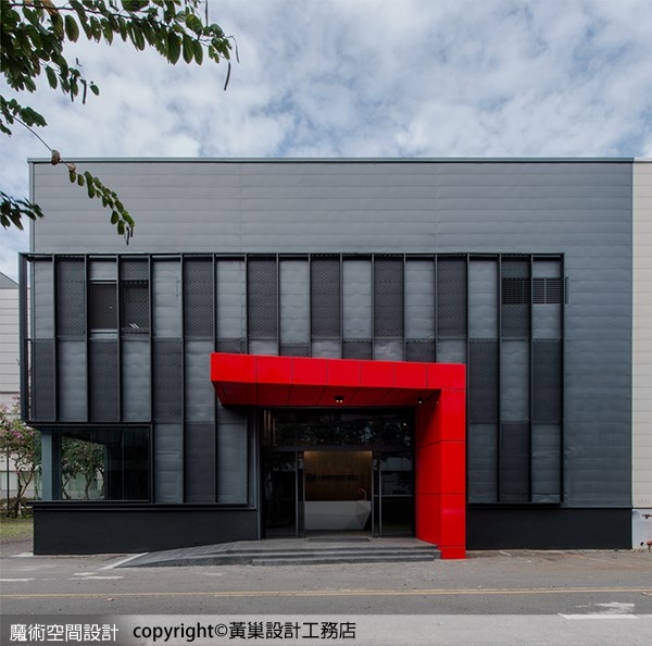 1.黃巢設計工務店運用鐵格網打造廠房外觀,加深底色襯托,棋盤交錯形式表現跳躍感,入口處新增導引斜坡,搭配法拉利紅雨遮,兼具指示與實質功能。