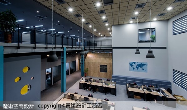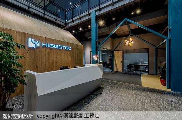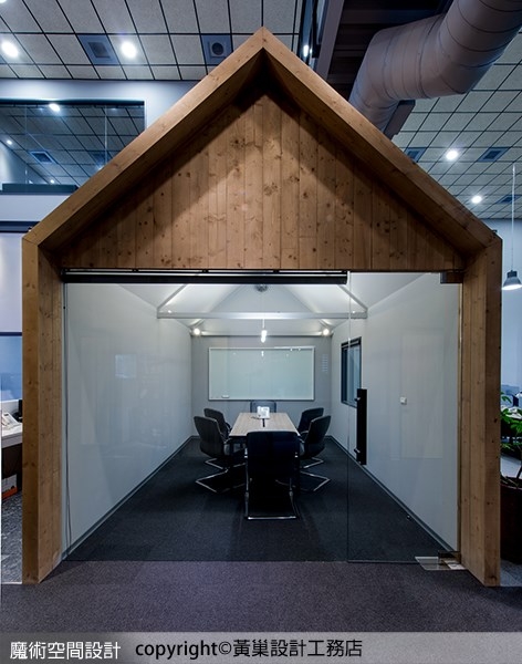 1.黃巢設計工務店以國際格局重新整理高科技質感外觀,內部以房屋意象為造型,把一家人的概念帶入企業空間表現,木質小屋、藍灰色屋架,成為挑高敞闊空間裡出色的視覺焦點。