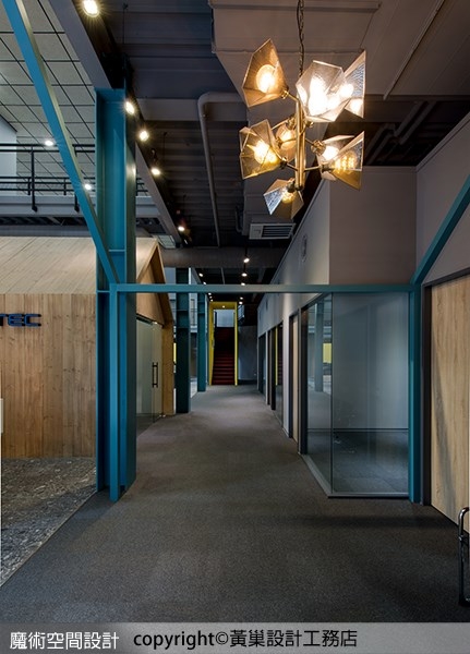 2.黃巢設計工務店為了讓廠辦裡工作的人,感到溫暖、放鬆,特別在材質上選用木質增加溫潤度;色彩計畫包含起士黃、藍灰、紅色等,在偏冷調的空間調入活潑彩度。