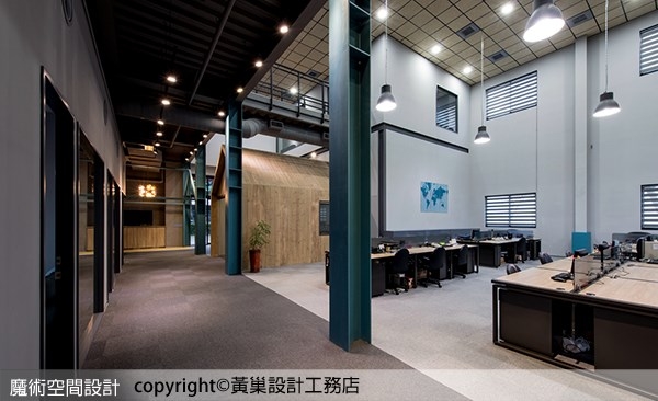 300坪超大空間以工作性質分區配置,黃巢設計運用玻璃、鐵件隔間,保持敞闊挑高氣勢,局部點綴繽紛色彩、木質造型,增添溫度、活化工作氣氛。