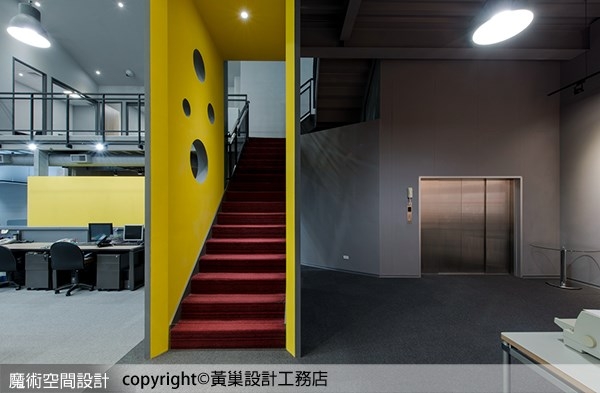 5.黃巢設計工務店特別以起士黃及乳酪洞意象,讓通往1.5樓的樓梯,明亮又有趣;茶水間也以醒目的黃色外觀,讓員工感受愉悅的正能量。