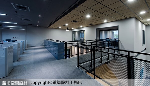 7.2樓大工作區以空橋連接獨立高層辦公室,圍欄以黑色鐵格網呼應建物外觀材質,也讓空間保有穿透效果。