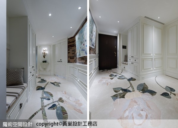 1.玄關地坪以大理石水刀拼花一路延伸,呈現四朵綻放程度各異的玫瑰花姿,優雅美麗地迎接喜愛玫瑰花的屋主,玄關端景櫃也雕刻玫瑰圖飾呼應。