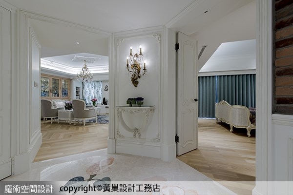 為了展現高貴不俗質感,找尋歐洲各國特殊五金、門把、開關,甚至上百年骨董燈飾來搭配,特製藝術線板,工序複雜的仿古烤漆呈現歷史感,人字實木地板呈現宮廷風,在低調中點點滴滴醞釀古典風華。