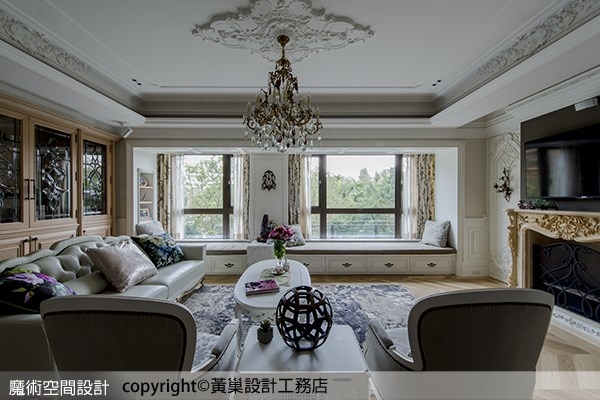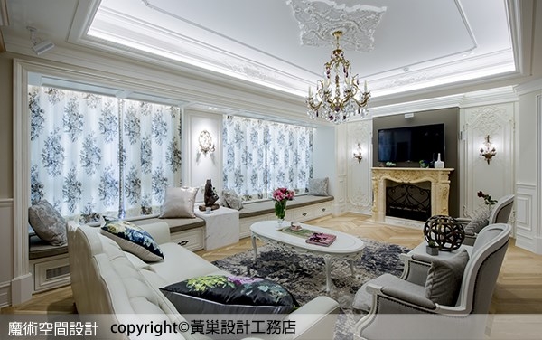 ▲黃巢設計工務店特別挑選英國皇家系列窗簾,美麗的布幔拉起時,自然融入客廳古典浪漫情境。