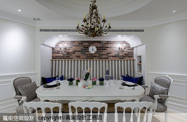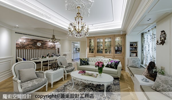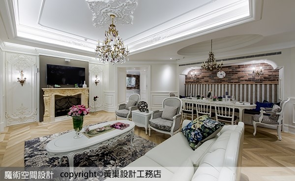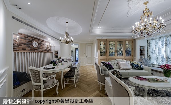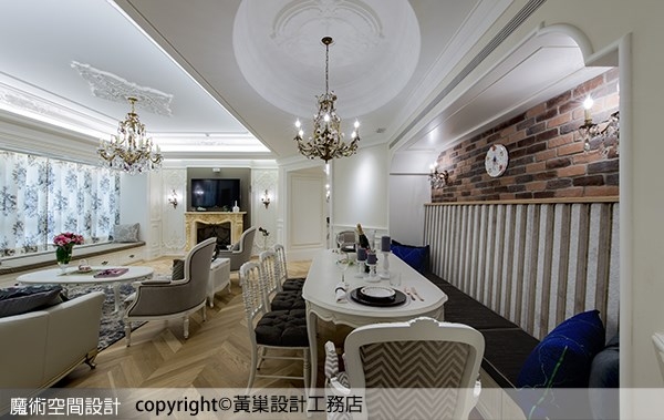 ▲黃巢設計工務店在開放的客餐廳,以天花板造型做分野,並透過精挑細選的古董水晶燈飾,聚焦不凡韻味。