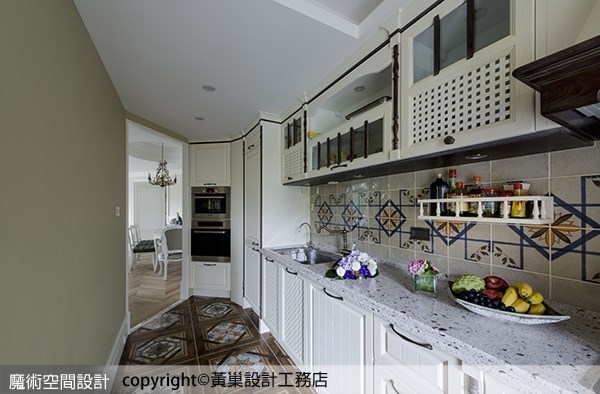 5.廚房大小電器均隱藏於櫃體內,選用結晶花色石英石為檯面,搭配復古花磚,顯出悠閒鄉村風。