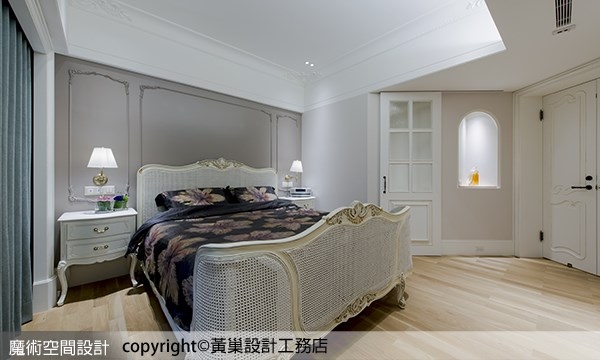 ▲主臥主牆選用舒服沉穩色調,搭配白色古典的床架及壁燈,典雅浪漫迷人。