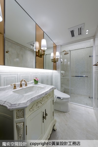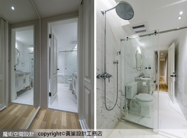 ▲近浴室立面鋪陳大片穿衣鏡,裝束儀容之外,也放大空間感;浴室設計延續白色及古典元素。