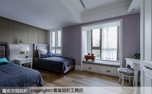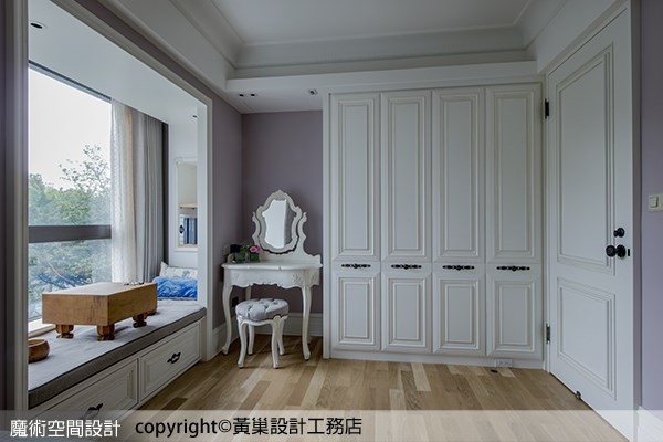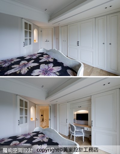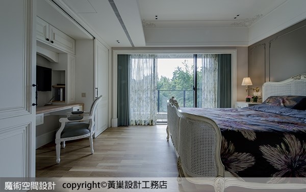 ▲黃巢設計工務店於床尾立面運用古典簡約櫃門,整合收納及書桌、書櫃。
