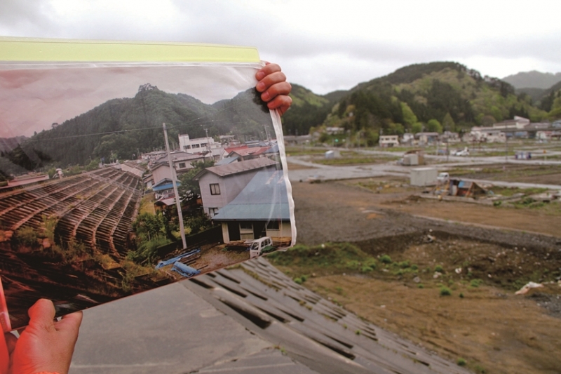 這一天,我們站在長堤上,赤沼先生拿出對比照片說明海嘯對田老造成的改變,其實不用說也知道,從前我看過的平房不見了,田老町將房屋殘骸清理乾淨,望去是一片空空的平地。